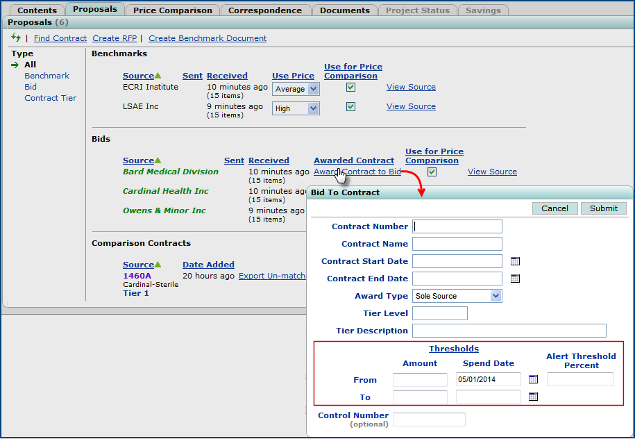 Sourcing & Contract Management main Contents > Supplies > Projects > select project > Proposals