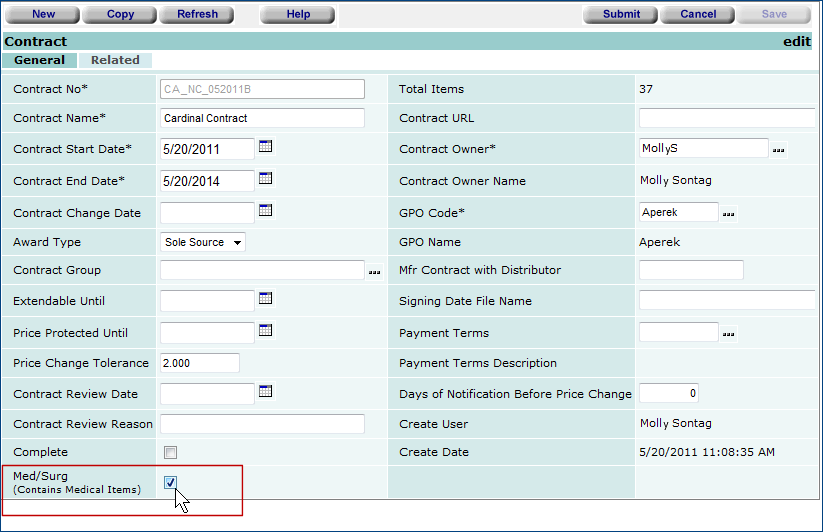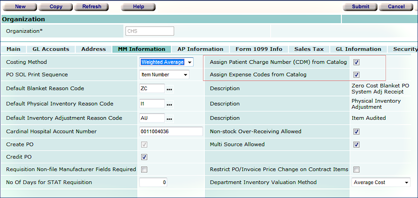 Previously, if no values are specified as the defaults on an item catalog record, when the organization flags are set, the fields could not be entered on an inventory record. In this release, the restriction is lifted: even when the organization flags are set, if an item catalog record contains no values for default Patient Charge Code (CDM), Billable Expense Code and Non-Billable Expense Code, the item inventory record can be edited and values for the fields entered.