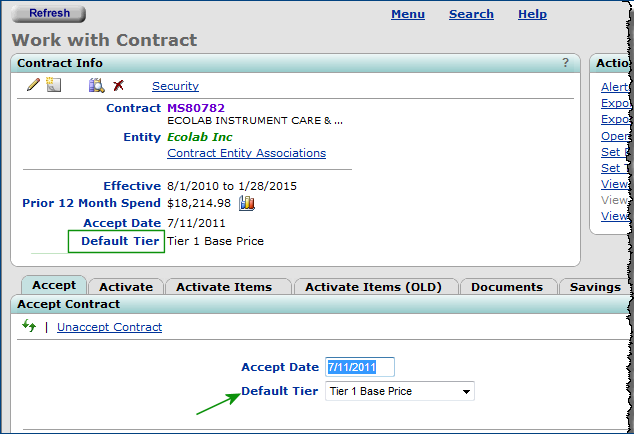 If an activated contract is updated, and a new vendor is available, activating the new vendor's prices occurs at the default tier. Once a contract is activated, the default tier cannot be changed.