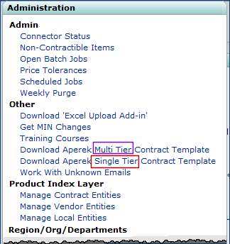 When you export a contract from Aperek -- for example, using the Export Contract link on the "Work with Contract" Actions panel, you can select the Excel format for the contract file. The new, multi-tier, multi-contract format is available, but you can also select the simple, one tier-format. See the online documentation topic "Export a Contract" for details.