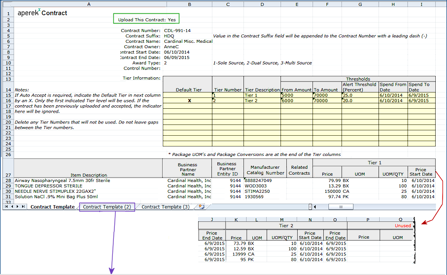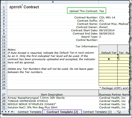 For each contract that you wish to upload, set the field Upload This Contract to Yes. This field is located at the very top of each worksheet (Figure 6, green box). The default for the first worksheet is always Yes. For all other worksheets, the default is No. So, if you have multiple contracts to upload, you need to set this field to Yes on each worksheet. The user for the example contract (Figure 6, inset) has entered Yes on the second worksheet.