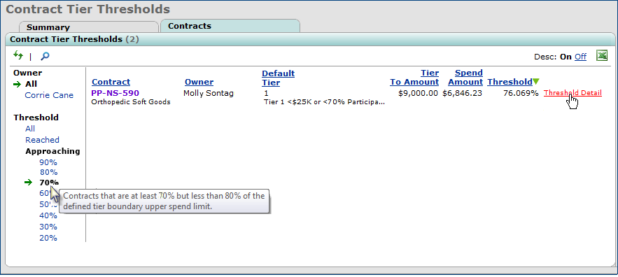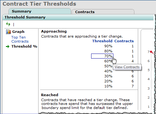 Alternately, you can click the Contracts tab directly, without making any selection in the Threshold Summary panel Approaching table. The Contract Tier Thresholds panel (Figure 12) appears with contracts at a default threshold of 80%, but you can select a different percentage.