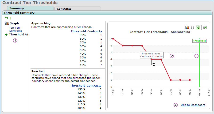 Mousing over any node on the graph displays the number of contracts with spend at the threshold. In Figure 10, for example, four contracts are at the 50% threshold. That is, spend for four contracts is between 50% and 60% of the way to the tier's top boundary.