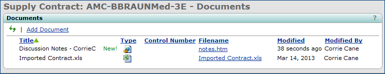 Sourcing & Contract Management main Contents > Supplies > Contracts > Contract Workbench > click documents icon ![]()