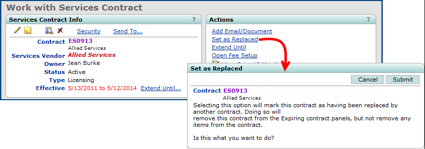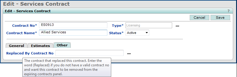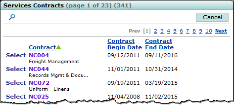 The Edit - Services Contract panel now contains three tabs: General, Estimates, and Other. (See Figure 17.) The Services Contracts panel is displayed when you select the General tab and click the prompt icon for the Replaces Contract No field, or when you select the Other tab and click the Replaced By Contract No field. The Contract Begin Date and Contract End Date are now supplied for each contract. (See Figure 19.)