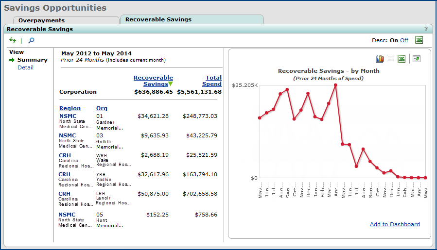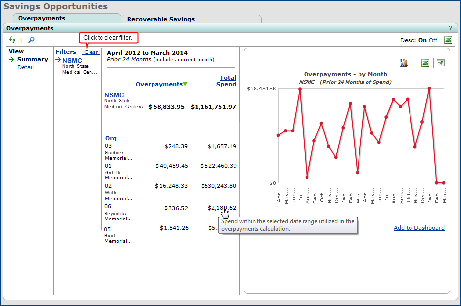The summary panels provide a single view of spend at various thresholds across all contracts. Two tables are available: