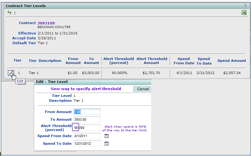 - The Alert Threshold Percent is the point at which you wish to be alerted about spend on the contract tier. For example, if the upper tier boundary (To Amount) is $100,000.00, and you want to know when you are at $90,000 (or 90 percent of the way to the tier boundary), set an Alert Threshold Percent of 90.