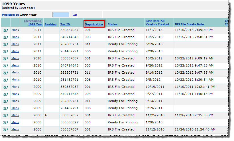 You can only see 1099 year data for organizations permitted in your data profile. Figure 30 is an example of the list. In the example, the user's data profile does not include organization 002. This organization's 1099 data does not appear on the list.