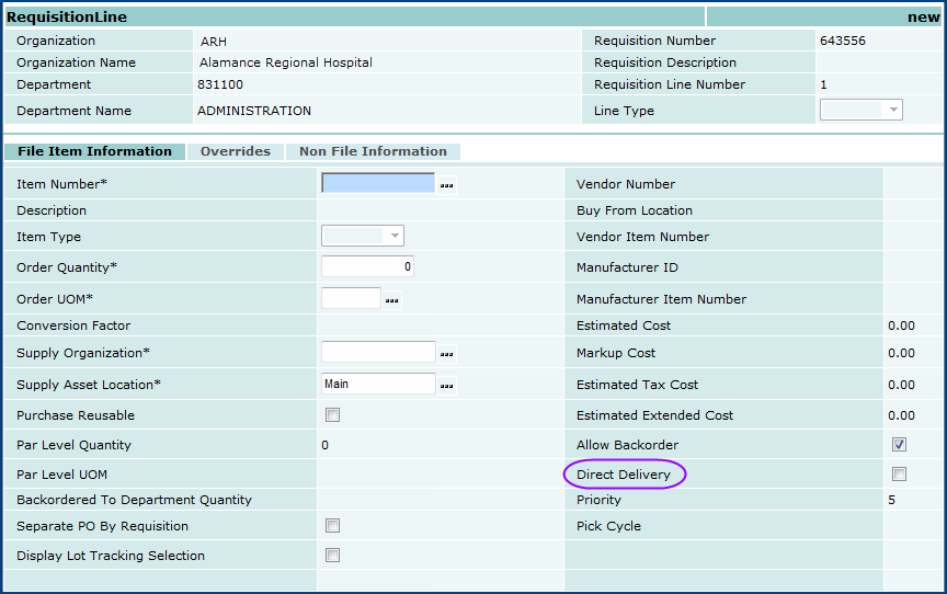On the Requisition Line panel (Figure 29), the Direct Delivery flag has been removed from the Overrides tab and added to the File Item Information and Non-File Item Information tabs to increase its visibility during the creation or editing of requisition lines.