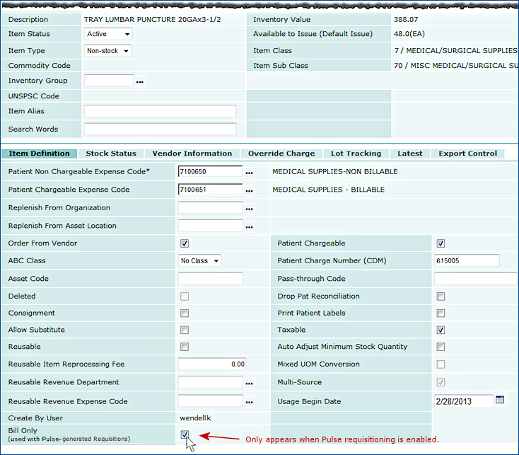 When you are creating Pulse requisitions, item inventory records contain a field that lets you specify whether bill-only requisition lines for an item should be "bill-only" or "bill-and-replace." The field is Bill-Only. This field is located on the Item Inventory panel's Item Definition tab (Figure 26).