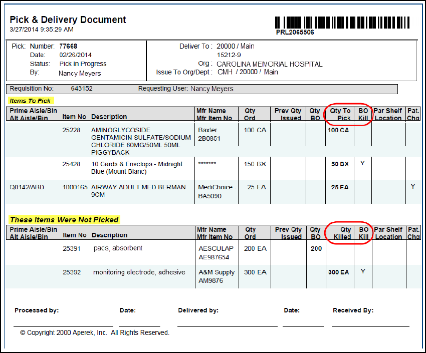 The new "Pick & Delivery Document" (Figure 25) has been improved to more clearly indicate the quantities that have not been picked because they have been either backordered or killed.