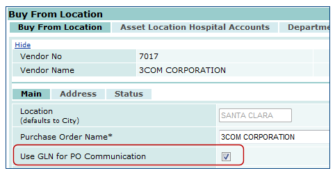 The two tab views on the Vendor Locations panel are Buy From Location and AP Location. These tabs differ from the views of buy-from locations and AP locations accessible through the Vendors panel menu; the Vendor Locations panel allows you to view locations for all vendors, and it allows you to search for a location by telephone or fax number.
