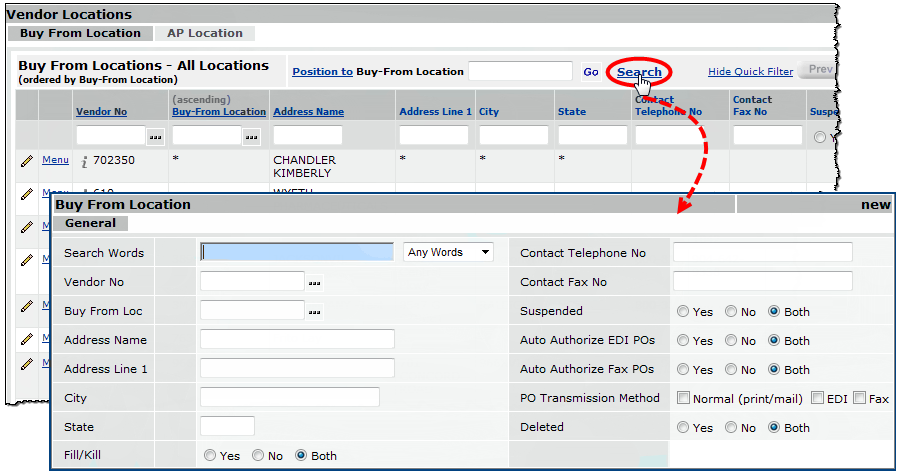 To search for a vendor, click the Search link. On the search panel that appears, you can do a full text search for the Vendor Number, AP Buy From Location, Address Name, or Address Line 1. You can search by Contact Telephone No or Contact Fax No using numeric values only. (See Figure 28.)