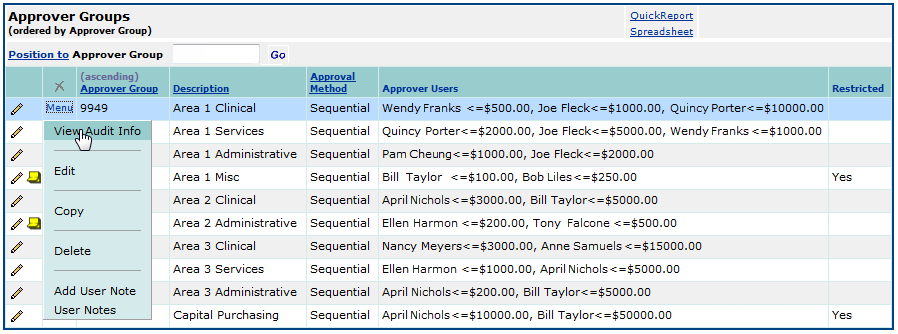 When you view the Approver Groups list in Requisitioning, you can select a new Menu item -- View Audit Info -- to display changes that have been made to the approver group. (See Figure 31.)
