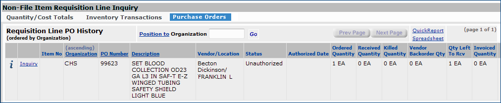 Downstream, information on the purchase order associated with a requisition can also be changed or added (as long as the purchase order is unauthorized). For example, since multiple vendors can exist for the same item, if a vendor is listed on a Mobile Implant case purchase order, the buyer will want to review the vendor information to ensure that the vendor is correct.
