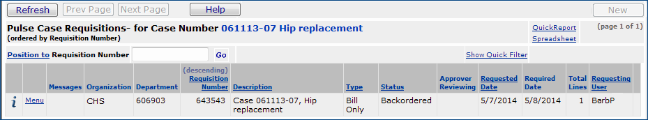 Cases - Requisitions Created lists cases that have one or more requisitions already created. The requisitions can be viewed, and you can drill down to item lines.