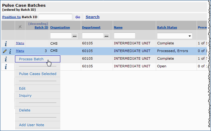 To reprocess a batch after making corrections, on the Pulse Case Batches list (Figure 17), click Menu > Process Batch.